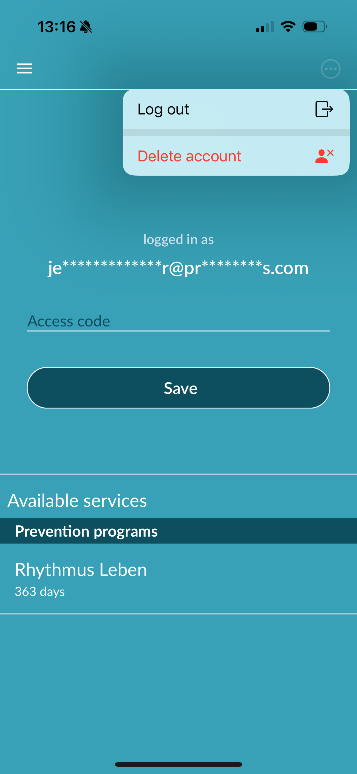 If you are logged out, please log in on the welcome page in the app using the „Log in“ button. Then click on the person symbol in the top left-hand corner of the start page. In the user account, you will see your encrypted e-mail address under „Logged in as…“. Click on the line below that says „Access code“ and enter the access code from your cover letter. Then click on „Save“. If the voucher is valid and has not yet been redeemed, the enrolment process will open.